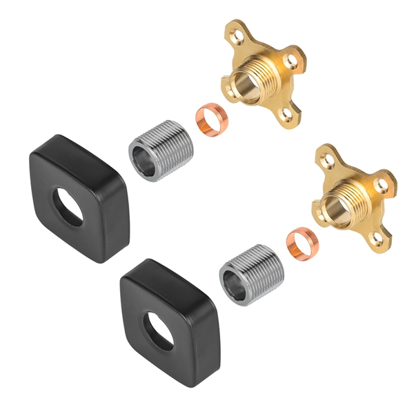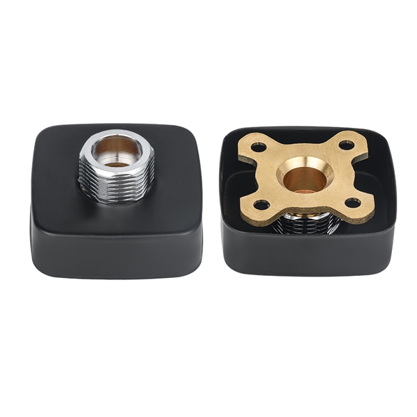 Black square Shower Faucet Plate.Its core purpose is to provide a sturdy, flat and easy-to-install base for wall-mounted faucets. The product adopts the composite structure of brass and carbon steel: the key force and connection parts that are in direct contact with the wall and the faucets interface use brass to ensure long-term corrosion resistance and tightness of the connection; As the main supporting structure, the plate body is made of high-strength carbon steel, which provides the necessary supporting rigidity for the whole and prevents deformation due to long-term stress. The surface of the plate body is treated by electroplating and other processes, showing golden appearance and easy to clean. It is designed as a standard square with a preset installation hole to match common faucet accessories and simplify the installation process.